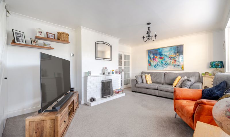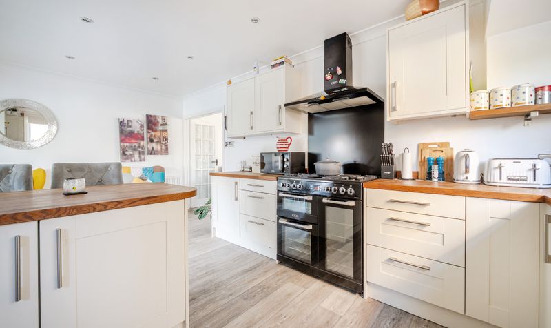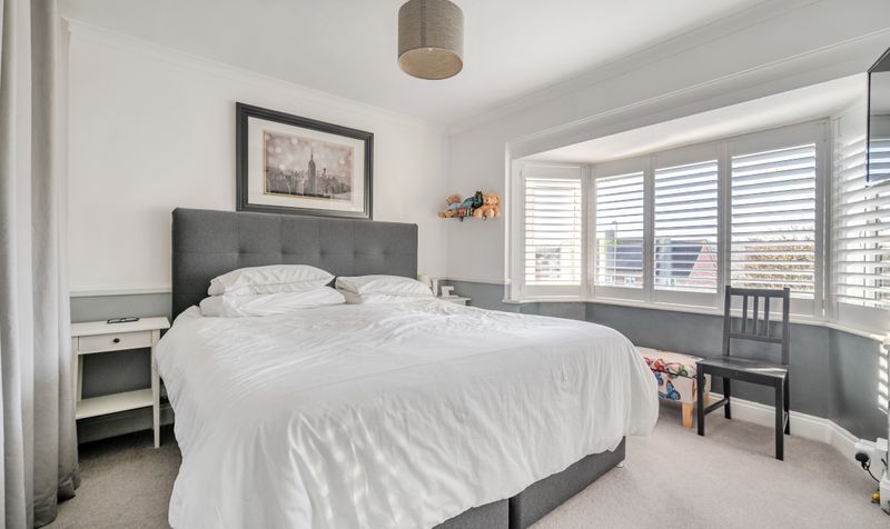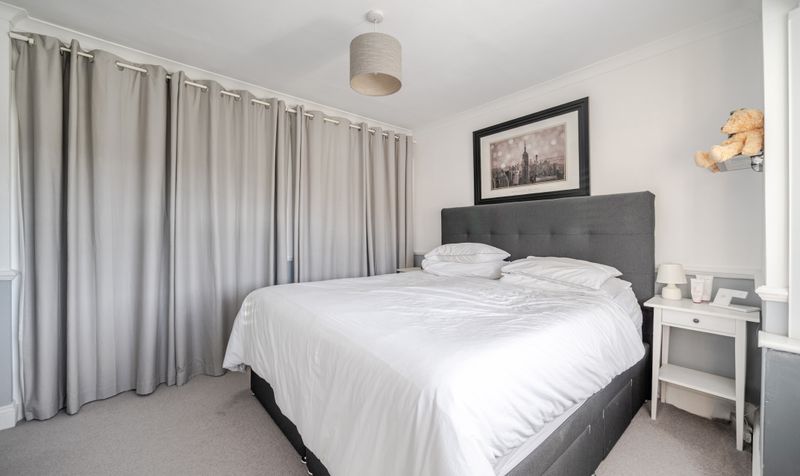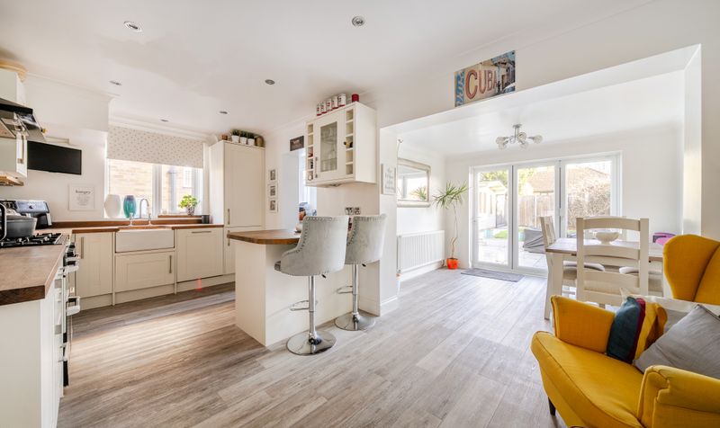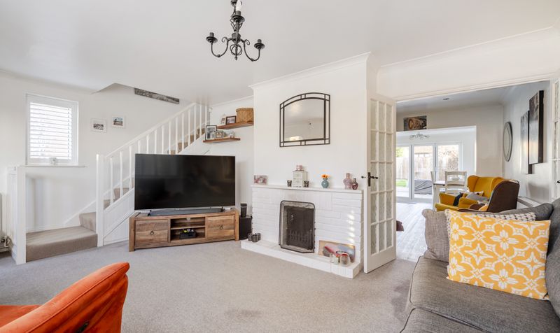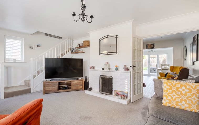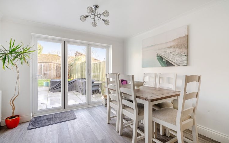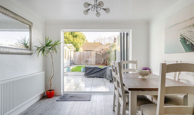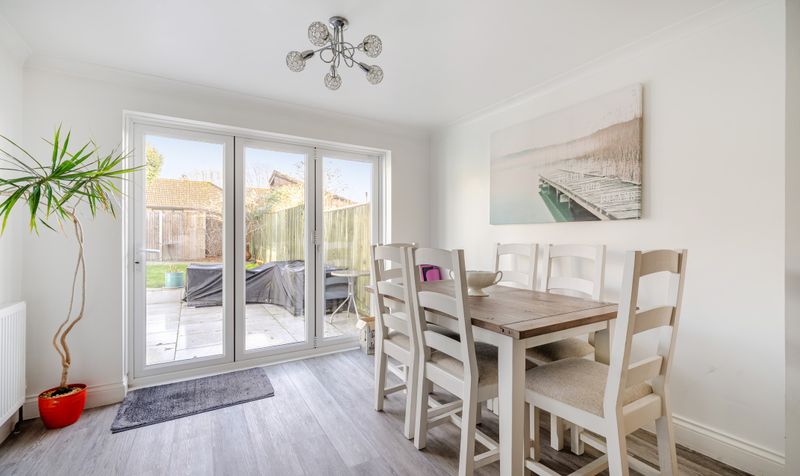 The ground floor features a bright and generous living room with a charming feature fireplace and a bay window, creating a warm and welcoming space. The modern, well-equipped kitchen flows into a separate dining room, where bi-fold doors open directly onto the garden, allowing for seamless indoor–outdoor living. A useful utility area completes the downstairs accommodation.