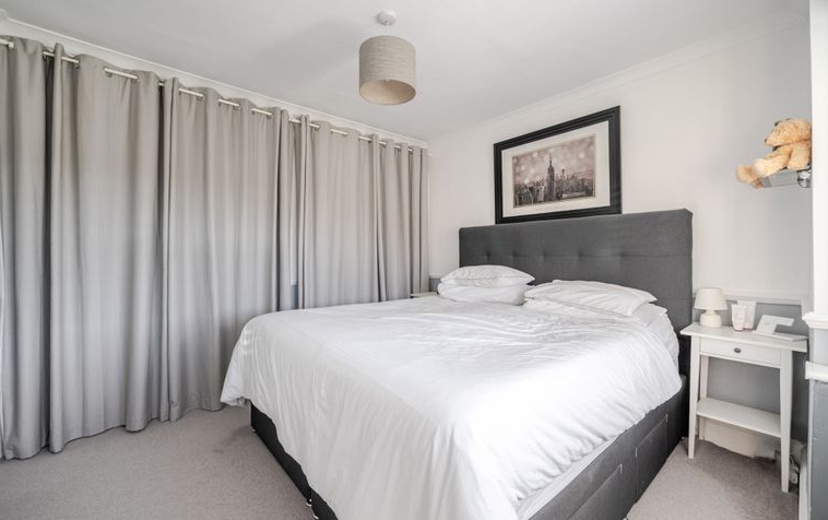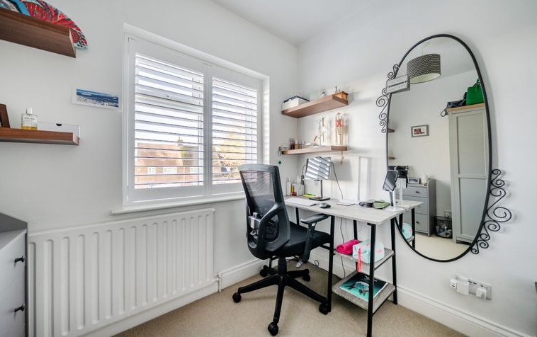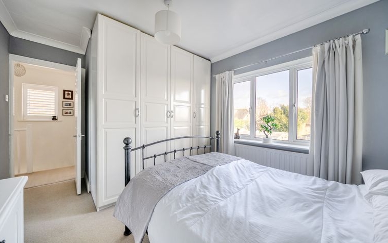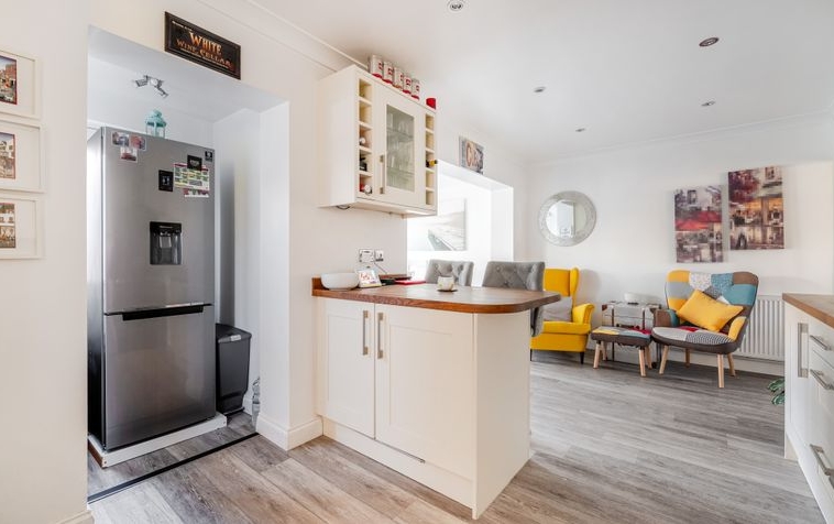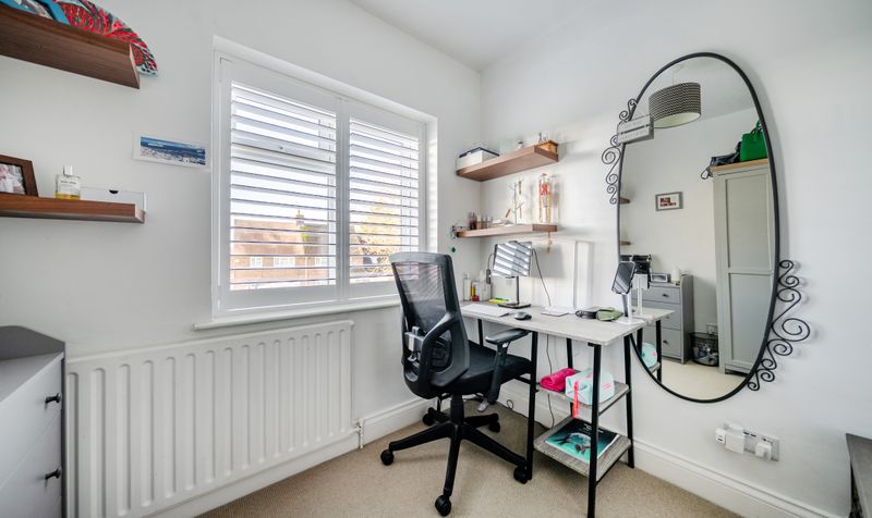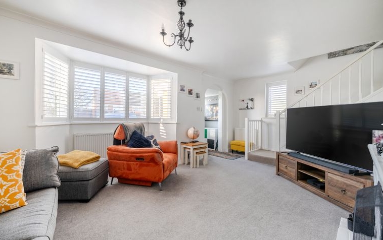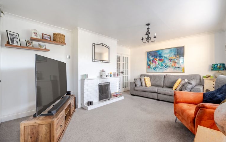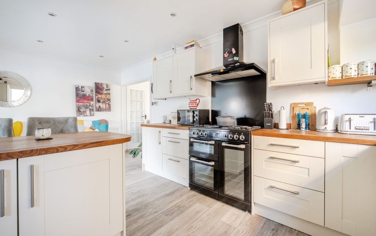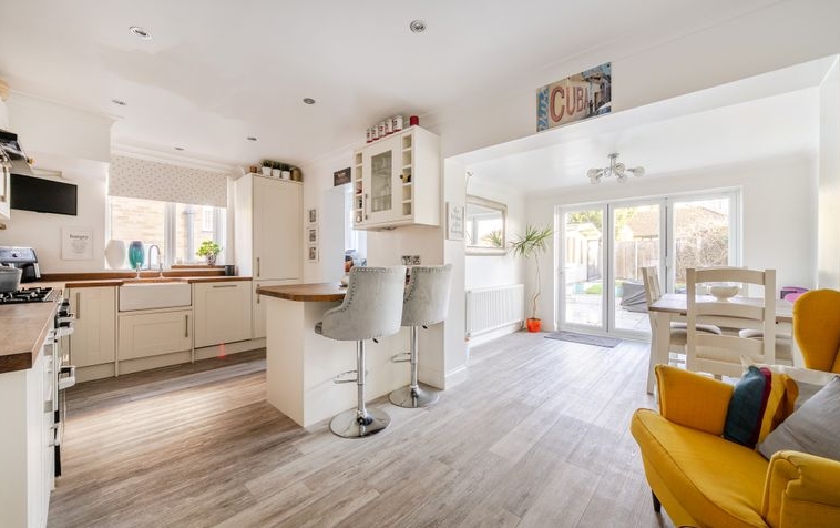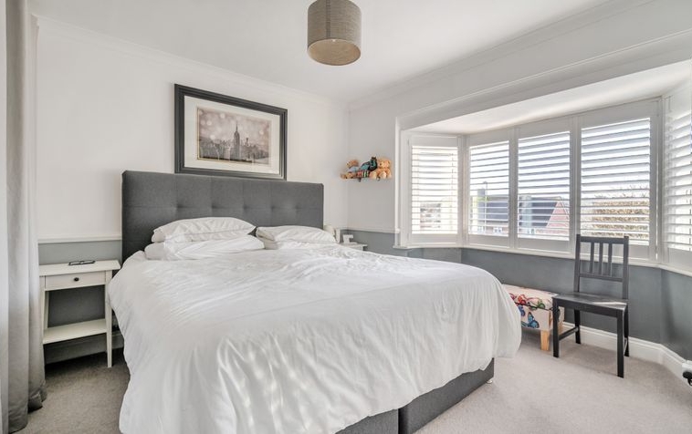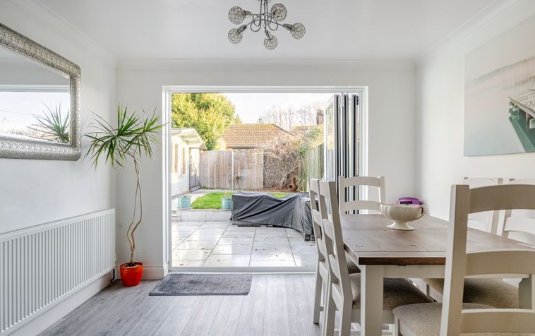 The ground floor features a bright and generous living room with a charming feature fireplace and a bay window, creating a warm and welcoming space. The modern, well-equipped kitchen flows into a separate dining room, where bi-fold doors open directly onto the garden, allowing for seamless indoor–outdoor living. A useful utility area completes the downstairs accommodation.