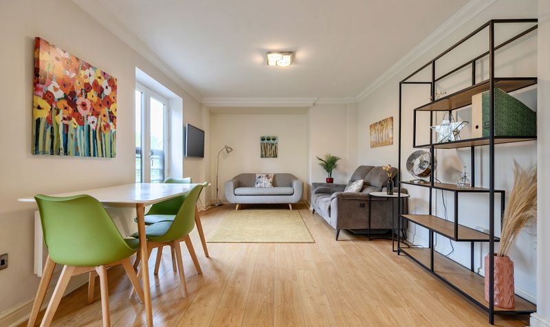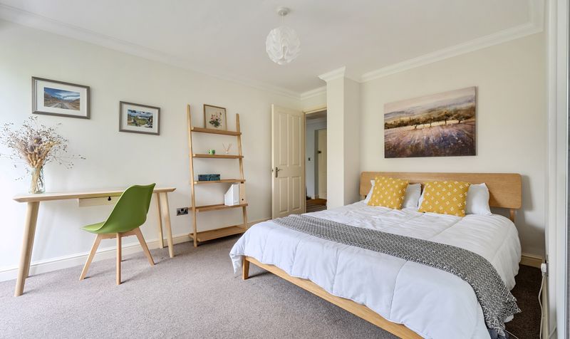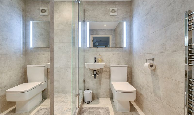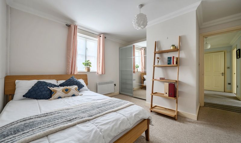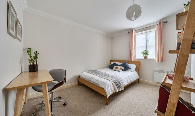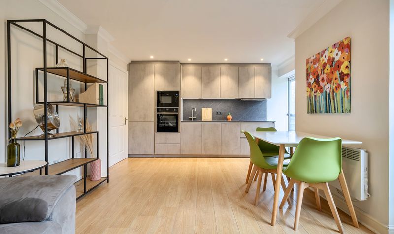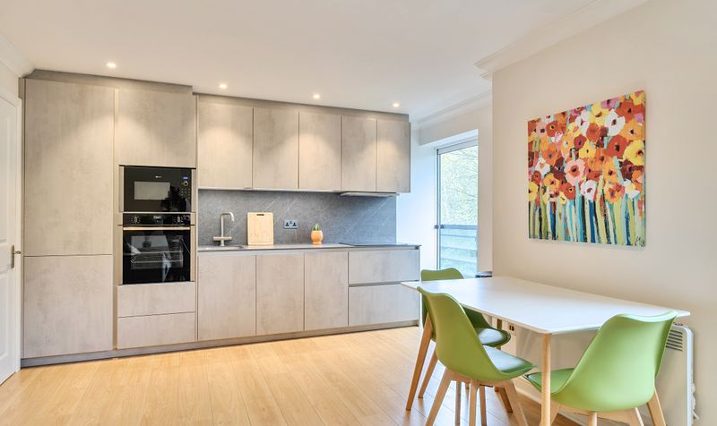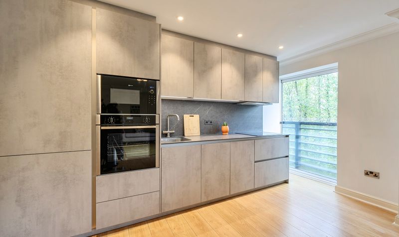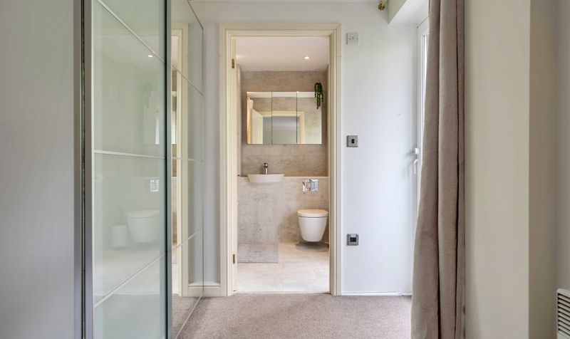 The bespoke handle-less German kitchen is a real feature, with sophisticated cabinetry hiding integrated appliances and a boiling water tap. Both bedrooms are well-sized, but the principal bedroom is particularly impressive, with floor-to-ceiling windows and a luxury en-suite bathroom. The apartment further benefits from an additional hotel-style shower room and generous hallway cupboards. Additional storage is provided in the building’s secure attached cycle store, where the property has its own large external lock up. Offered to the market with no forward chain, this property presents an excellent opportunity for a smooth and swift transaction.