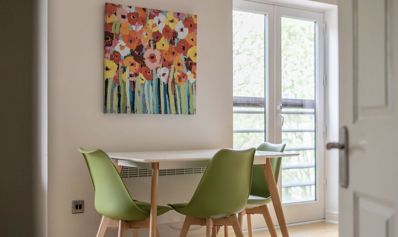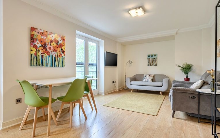 While entered at ground level, the apartment’s principal accommodation is elevated at the back of the building above the road level, providing an abundance of light and green views. The apartment is well proportioned throughout, including an exceptionally bright and spacious open-plan kitchen/reception/dining room with glass doors leading onto a balcony.