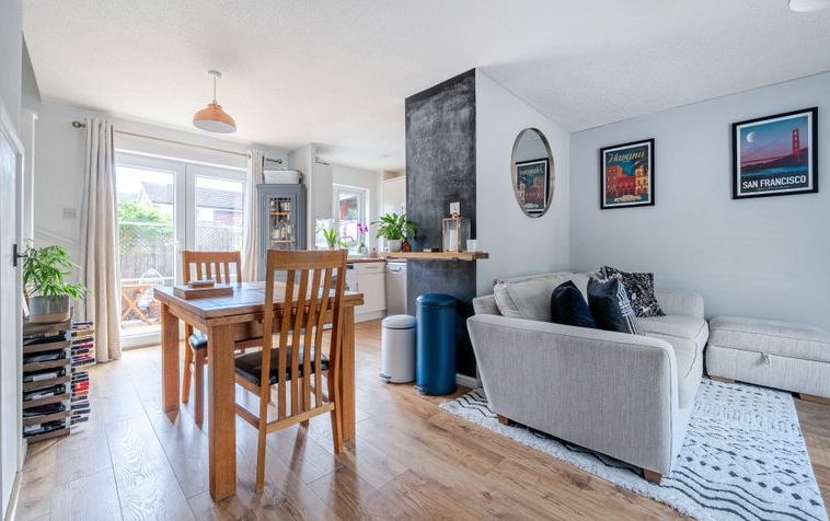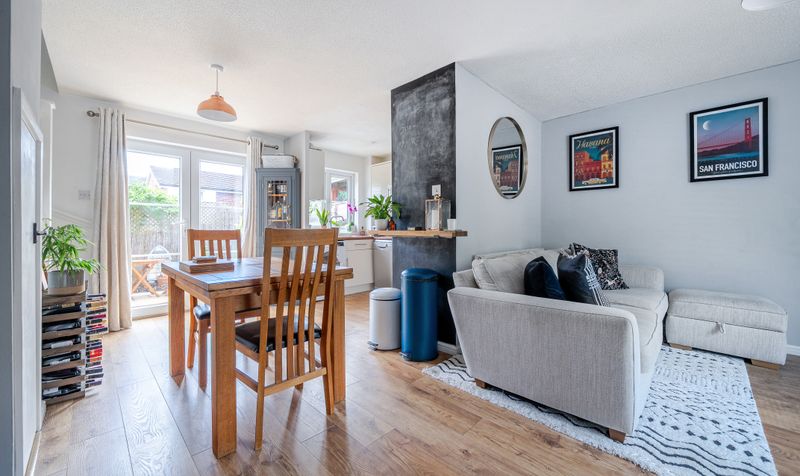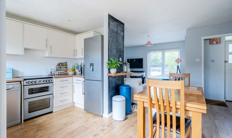 The property welcomes you with a practical entrance porch, leading into a bright and airy open-plan living area. The lounge provides a cosy and relaxing retreat, while the thoughtfully sectioned kitchen maintains an open feel, ensuring the space flows seamlessly throughout. Large front-facing windows and double doors opening onto the garden flood the room with natural light, enhancing the sense of space.