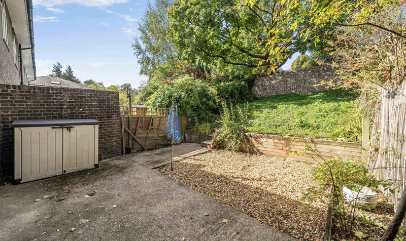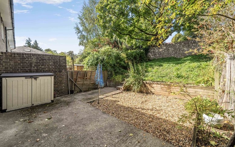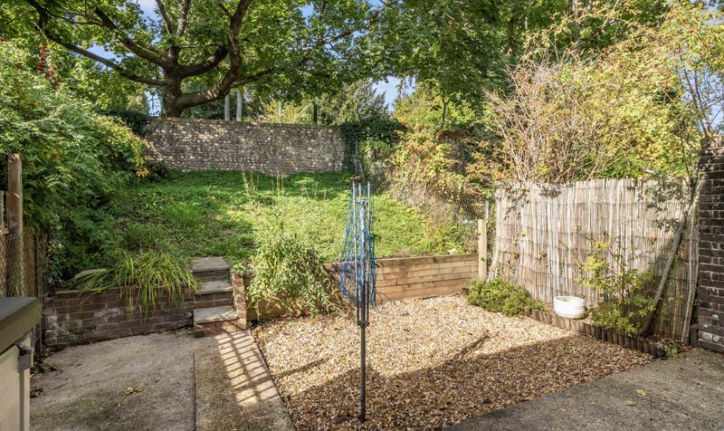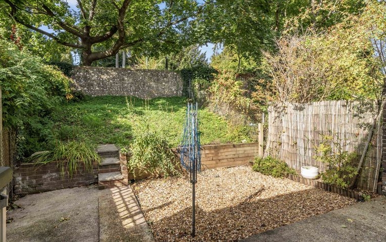 As you step out onto the garden is is currently gravelled with path leading up to the lawn which is slightly elevated. There is a characterful wall at the back which separates the garden from the Worthy Road.