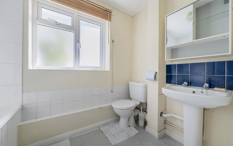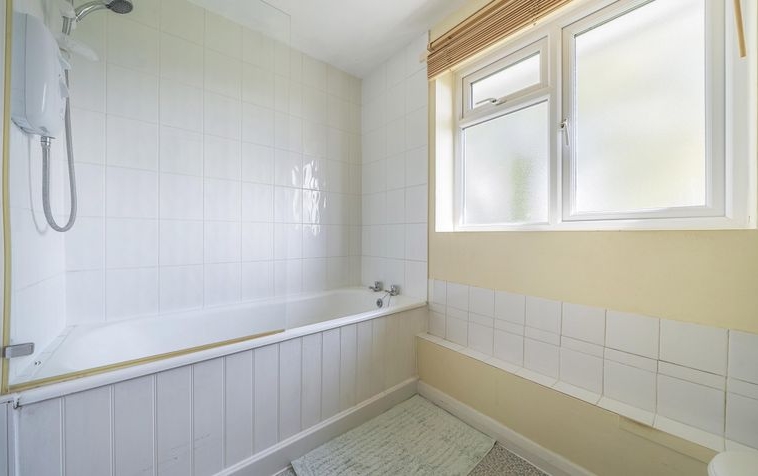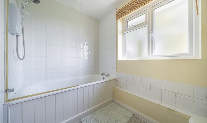 Dimensions: 5′ 7” x 8′ 6” (1.7m x 2.58m). There is a frosted wooden double glazed window looking out onto the front aspect. The shower is currently situated over the bath. This also contains a W/C, sink and single panelled radiator.
