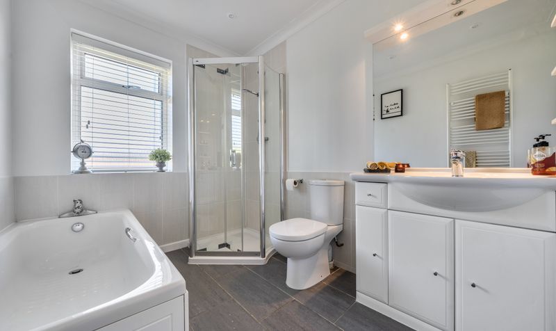 Internally, the bungalow is thoughtfully arranged across two floors. The ground floor features a generous living room with bay window, a bright and airy kitchen/breakfast room, and three well-proportioned bedrooms. There are also practical spaces including a utility room and a family bathroom.