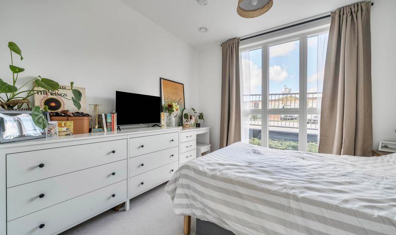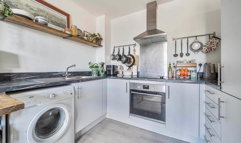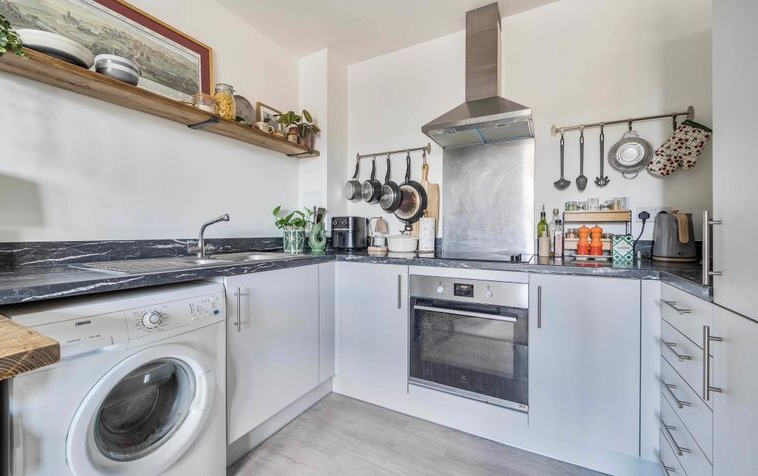 The accommodation extends to approximately 493 square feet (45.8 sq m) and comprises a spacious double bedroom, a generously proportioned and light-filled reception room, and a modern fitted kitchen complete with integrated appliances. The apartment also features a contemporary bathroom with a full-sized bath and overhead shower, and a welcoming entrance hallway with useful storage space.