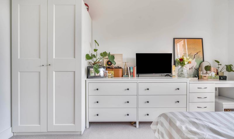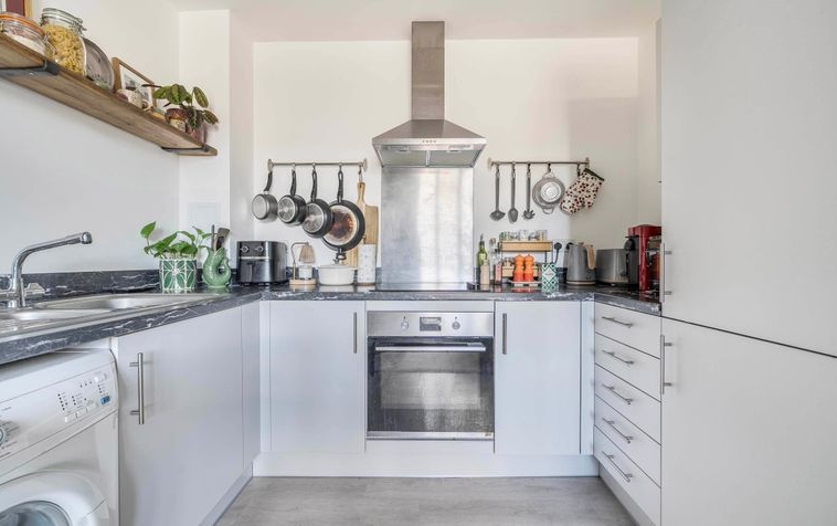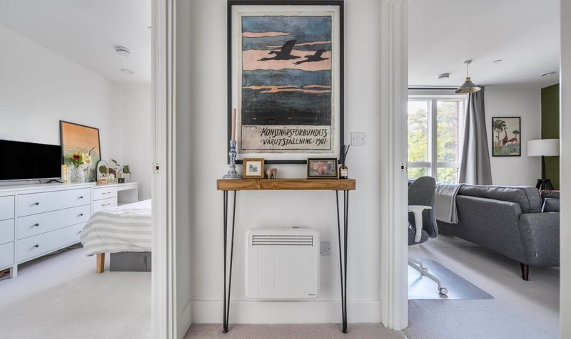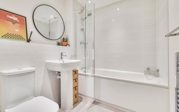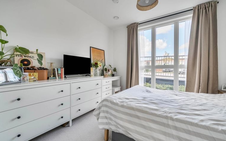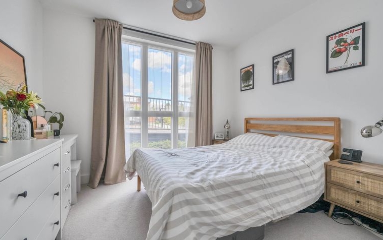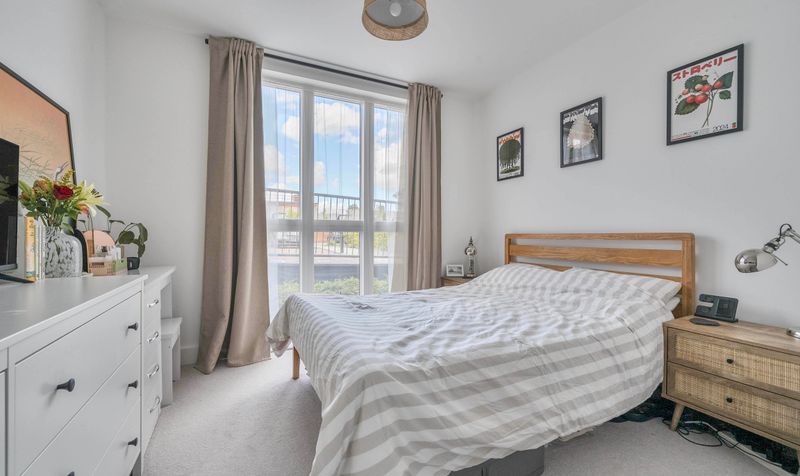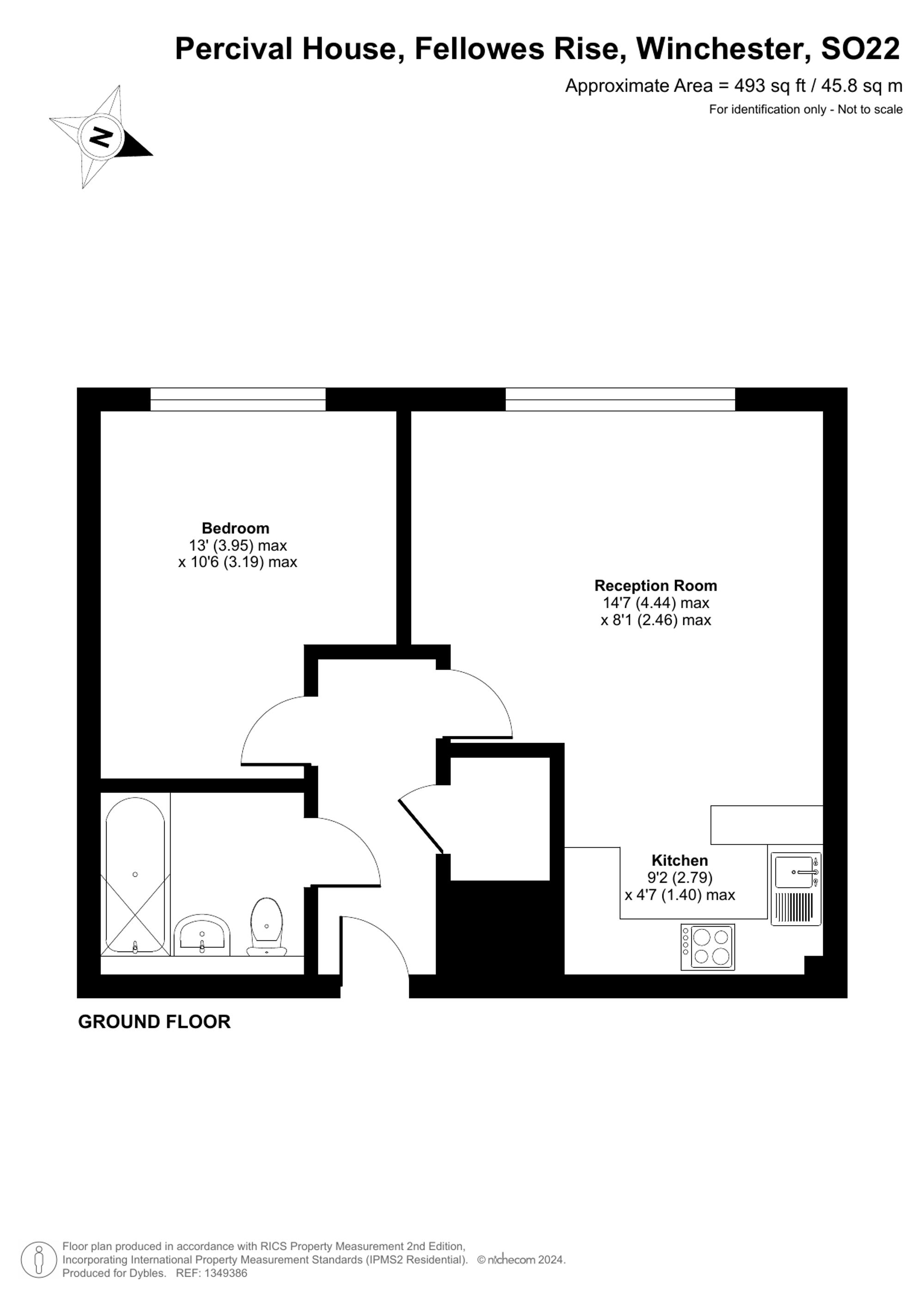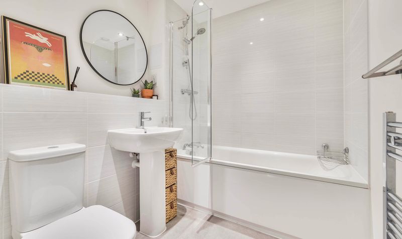 The accommodation extends to approximately 493 square feet (45.8 sq m) and comprises a spacious double bedroom, a generously proportioned and light-filled reception room, and a modern fitted kitchen complete with integrated appliances. The apartment also features a contemporary bathroom with a full-sized bath and overhead shower, and a welcoming entrance hallway with useful storage space.