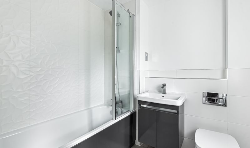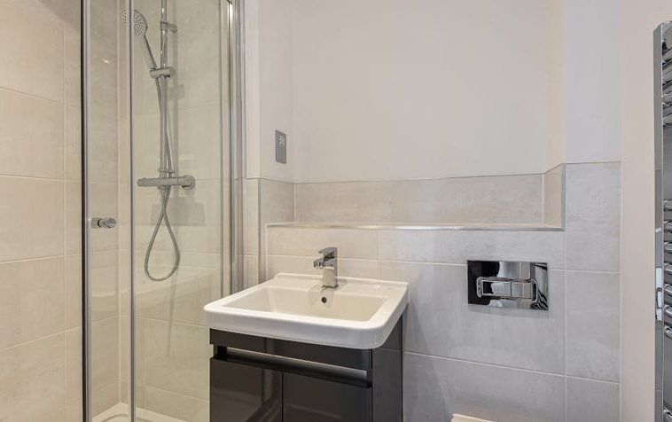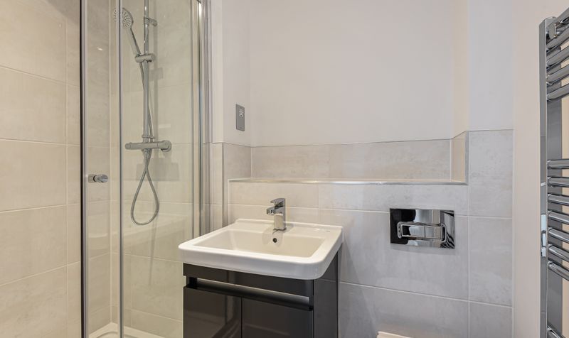 There are two well-proportioned bedrooms, including a generous principal bedroom measuring up to 15′ x 9′, along with a second bedroom ideal as a guest room, home office or nursery. The property is further complemented by a modern bathroom and an additional shower room, both finished to a high standard.