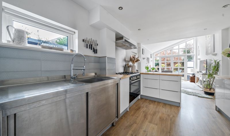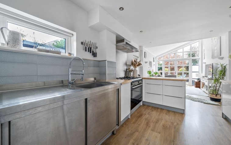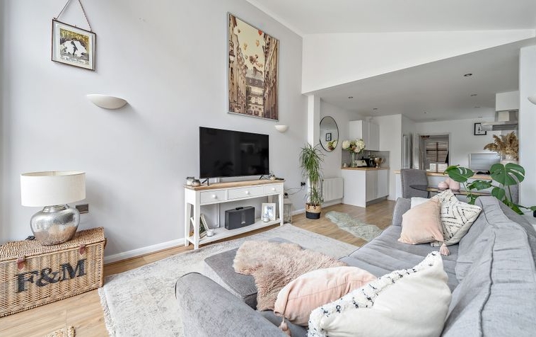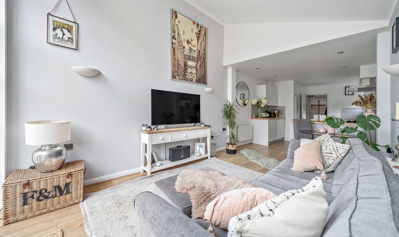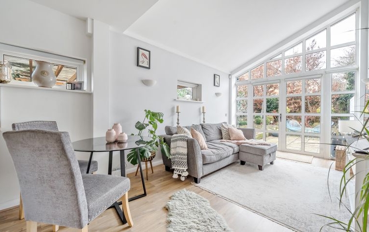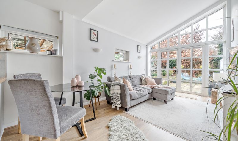 Straight ahead is a modern and well-presented open plan kitchen and living area. The contemporary kitchen comes complete with integrated appliances, ample countertop space and cupboards, along with a pantry/storage under the stairs. Beyond the kitchen, the living area ceiling rises giving the room real grandeur and the floor to ceiling crittall windows/patio doors allow large levels of light to flood the space. This really is a beautiful room and an ideal space to entertain, especially in the summer months, with the patio doors being fully open allowing a seamless transition from the inside to out.