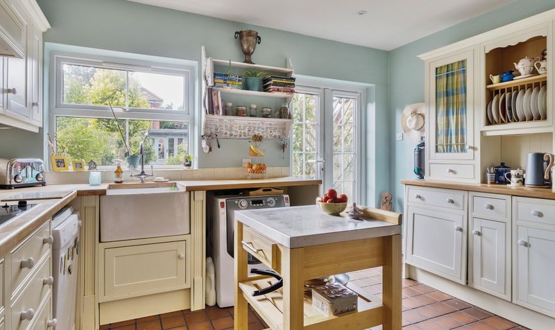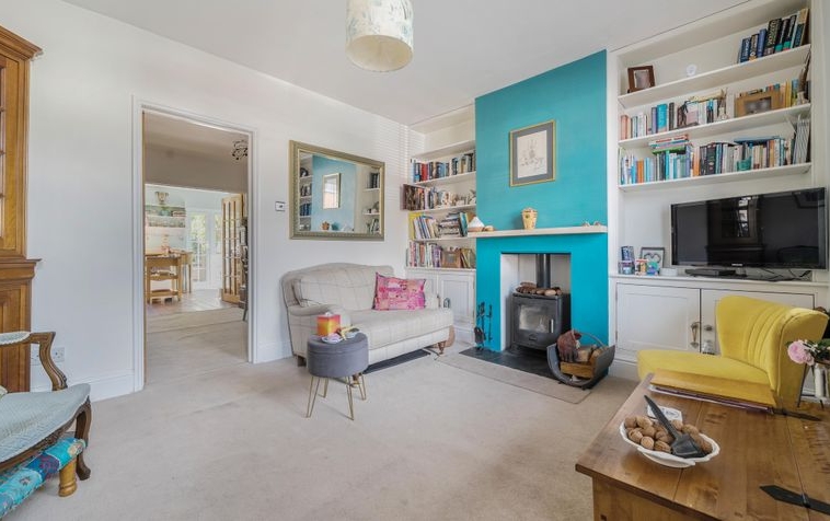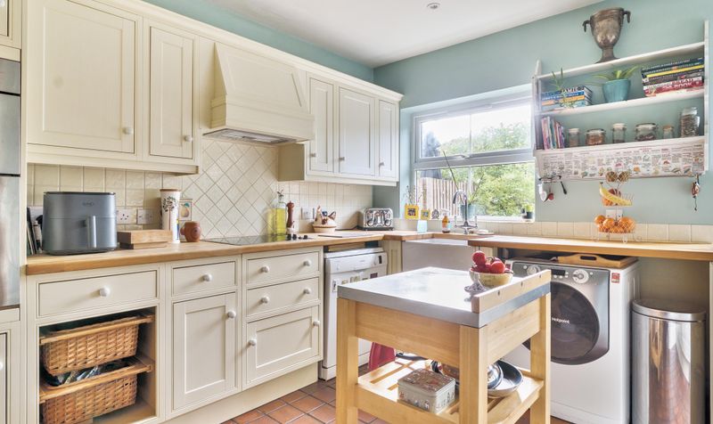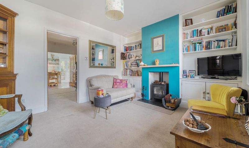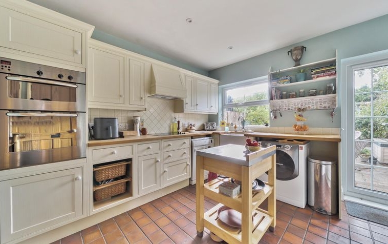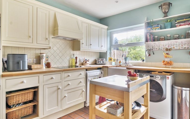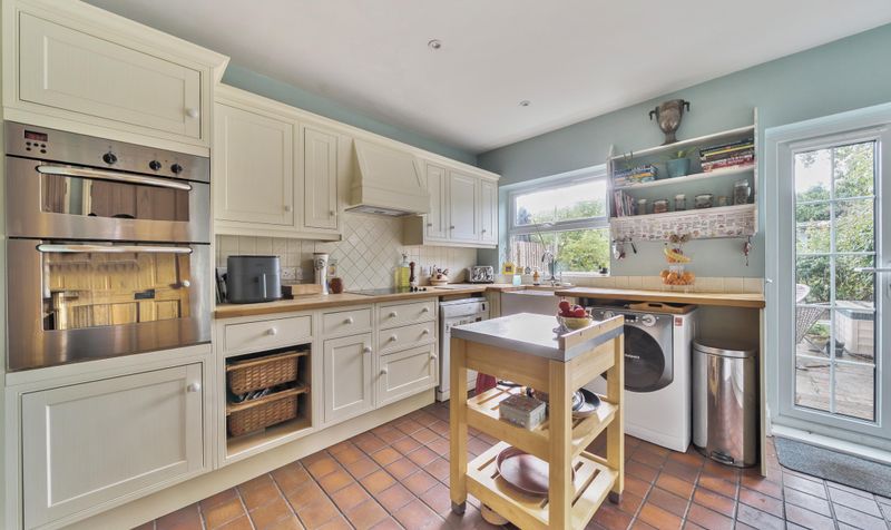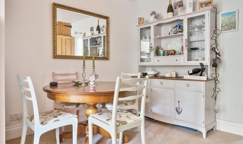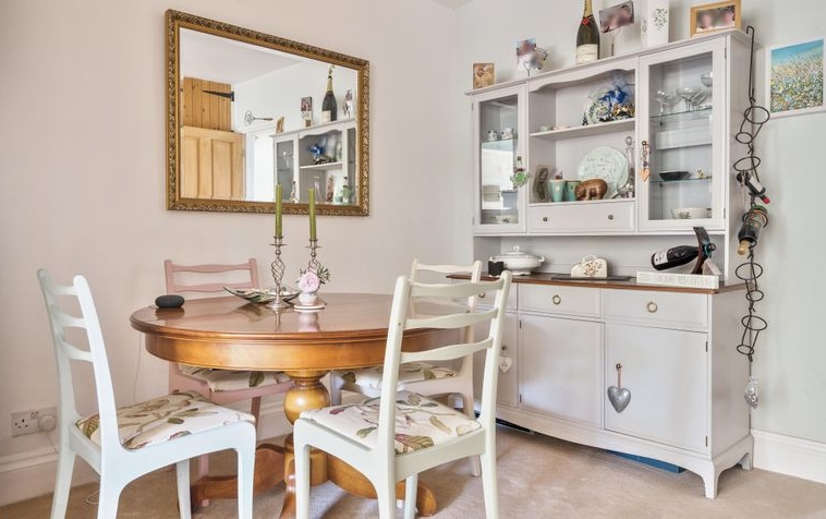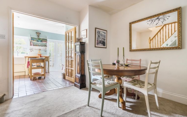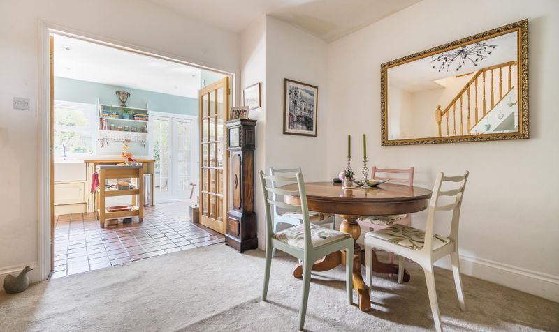 Inside, the home is full of charm and character. The cosy sitting room features a log burner, creating a warm and inviting atmosphere. From here, the layout flows through to the dining room and onto a bright and well-proportioned kitchen, with French doors opening directly into the garden – perfect for entertaining and everyday family living. A useful ground-floor cloakroom adds practicality.