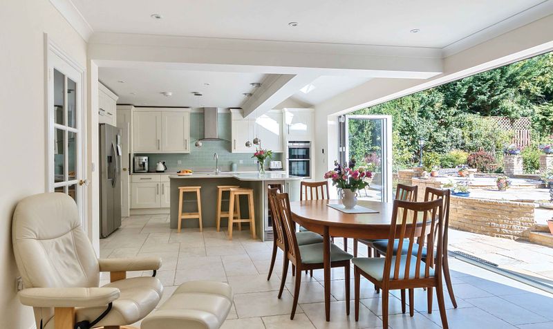 The modern kitchen/dining area is truly impressive, having been recently updated to feature a contemporary island and stylish finishes throughout including underfloor heating. Bifold doors open directly onto the rear garden, creating a wonderful indoor-outdoor living experience. Adjacent to the kitchen is a practical utility room, and the ground floor is further enhanced by a second sitting room and access to the integral double garage.