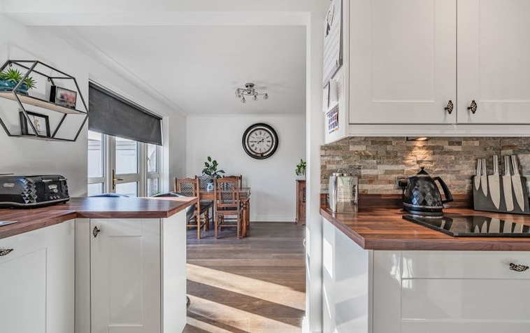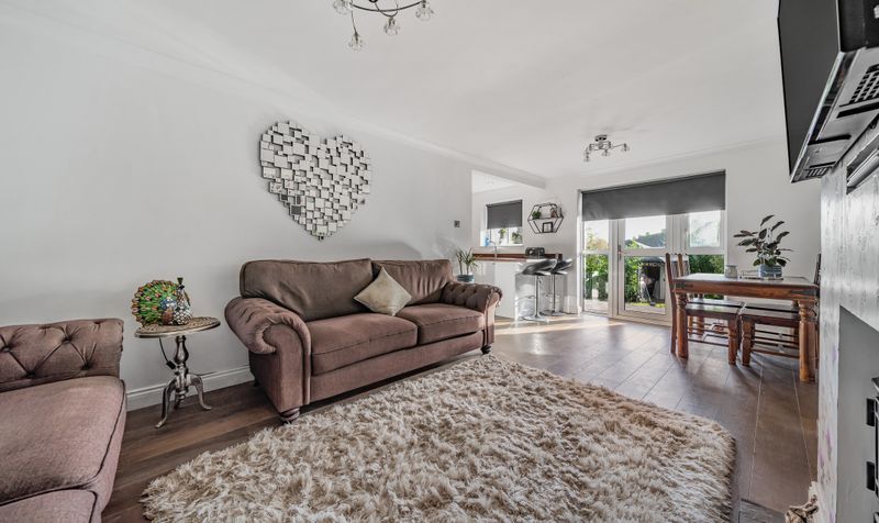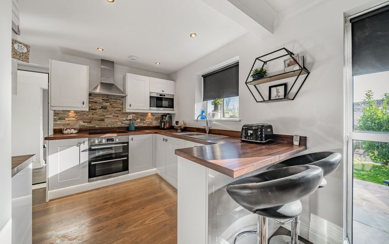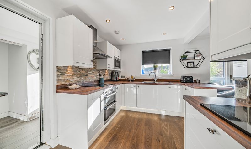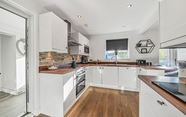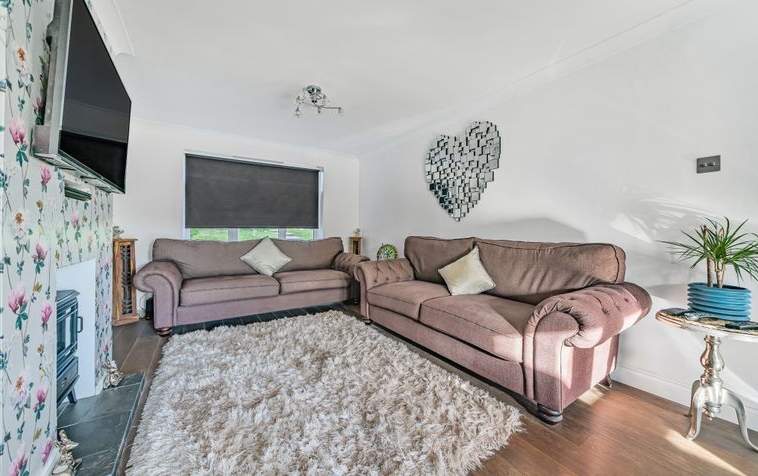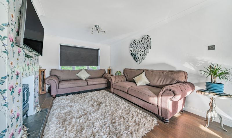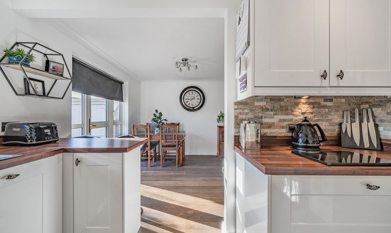 On the ground floor a useful porch leads to a welcoming entrance hall. At the end of the hall is the modern kitchen. The bright kitchen is well appointed with fitted units providing plenty of cupboard space and a door giving access to a side passage with storage and utility room. The spacious sitting/dining room has beautiful wood floors and a cosy log burner within the wallpapered chimney breast as a focal point and double patio doors leading out to the garden.