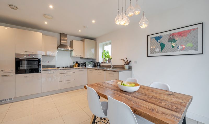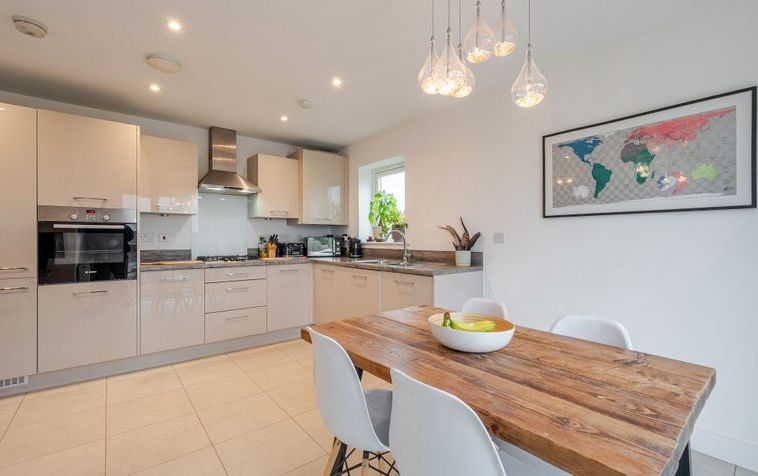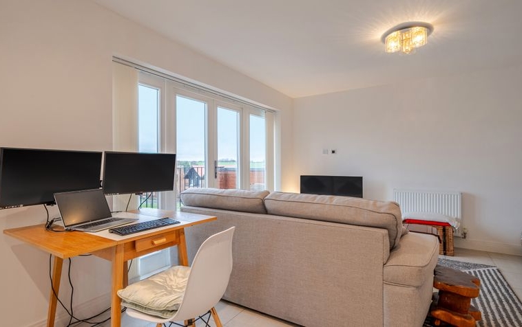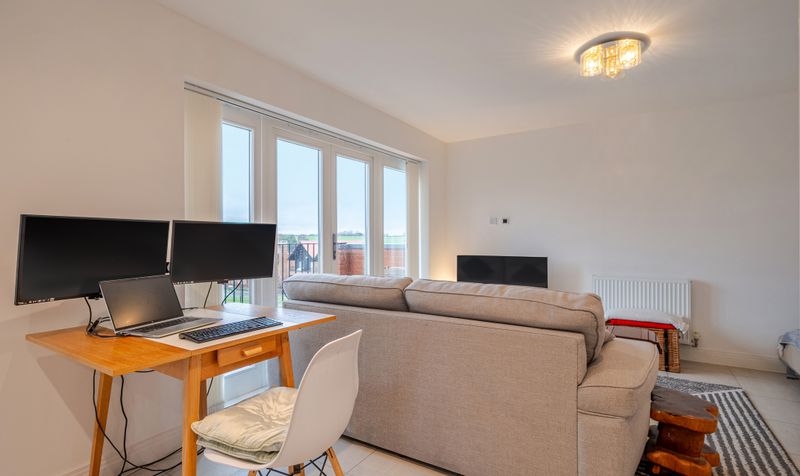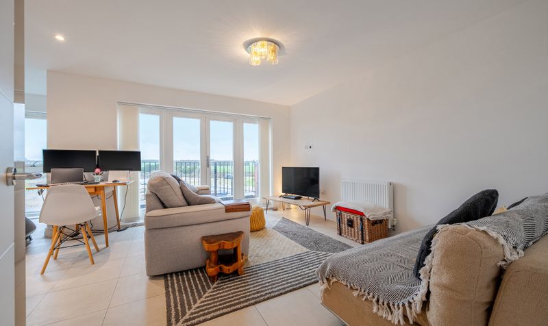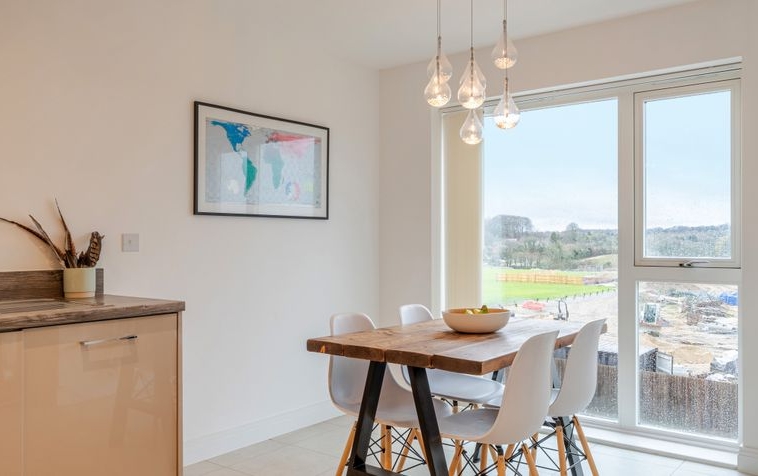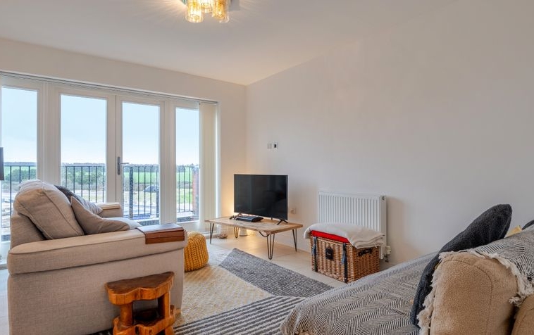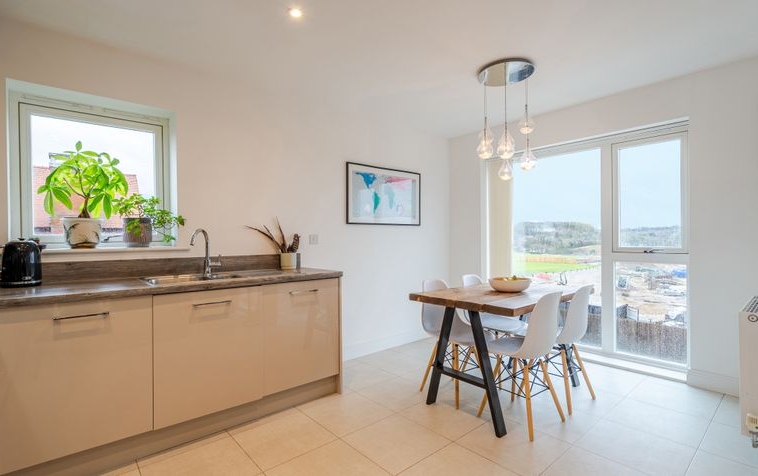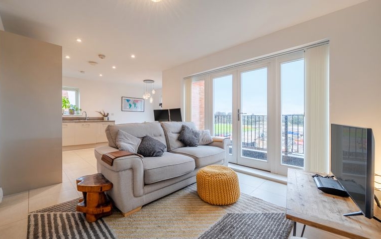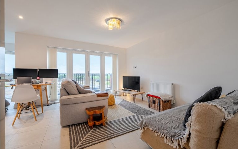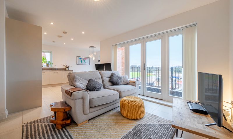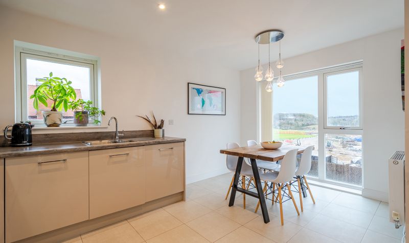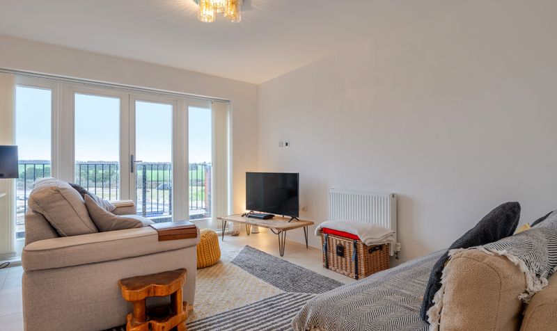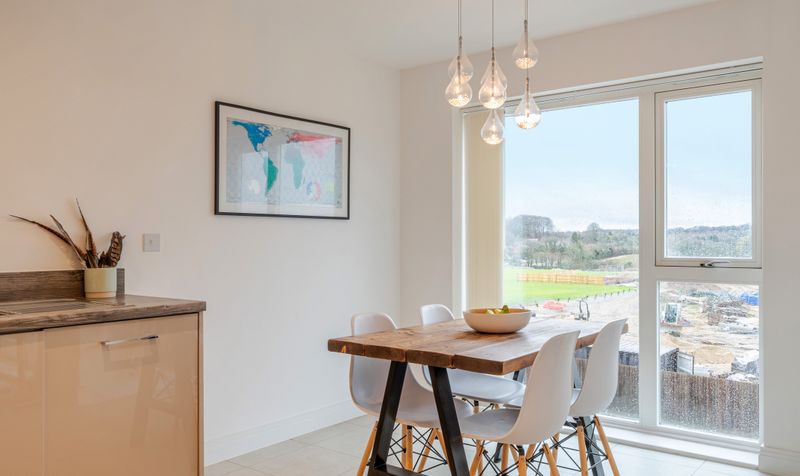 The hallway leads through to the heart of the home: a beautifully presented open-plan living, kitchen and dining space. The dual-aspect living area is flooded with natural light, creating a bright and versatile environment ideal for both everyday living and entertaining. Floor-to-ceiling windows and French doors open onto an east-facing balcony, offering delightful views across the surrounding countryside.
