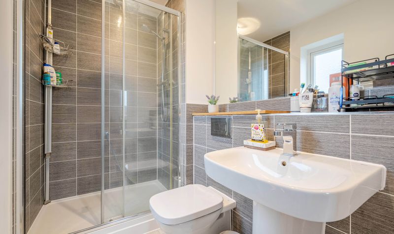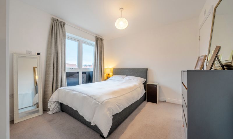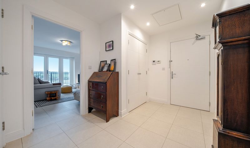 The apartment is accessed via both lift and stairs, opening into a welcoming entrance hall featuring a generous storage cupboard and the added security of a video intercom system. From here, there are two well-proportioned double bedrooms, one of which benefits from fitted wardrobes and a modern en-suite shower room. A stylish and contemporary family bathroom completes the accommodation, fitted with a shower over the bath.